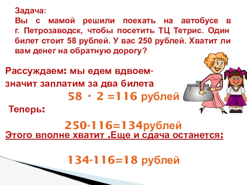 г. Петрозаводск, чтобы посетить ТЦ Тетрис. Один билет стоит 58 рублей. У вас 250 рублей. Хватит ли вам денег на обратную дорогу?