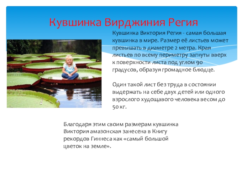 Благодаря этим своим размерам кувшинка Виктория амазонская занесена в Книгу рекордов Гиннеса как «самый большой цветок на земле».