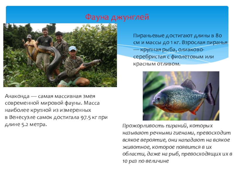 Прожорливость пираний, которых называют речными гиенами, превосходит всякое вероятие, они нападают на всякое животное, которое появится в их области, даже на рыб, превосходящих их в 10 раз по величине