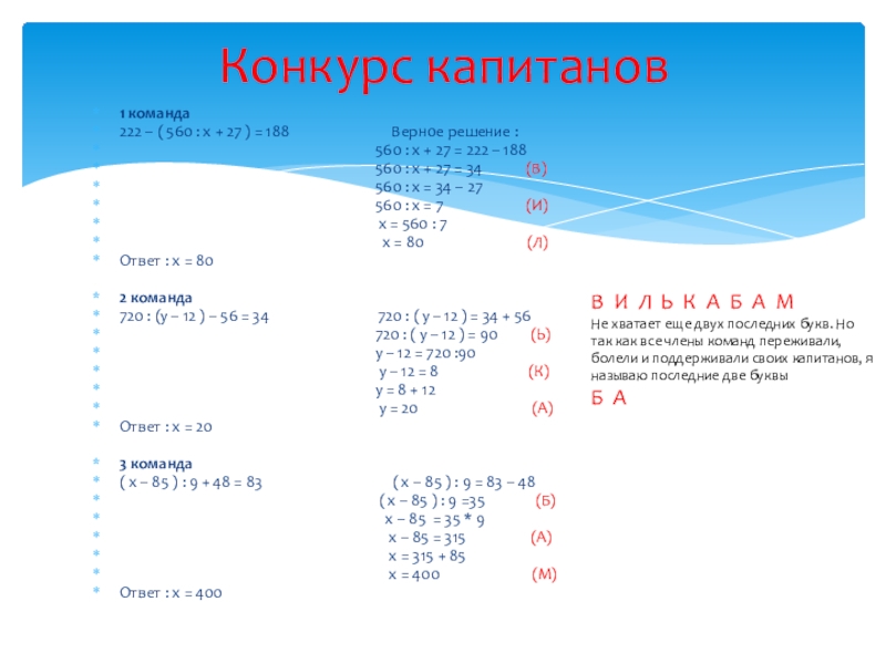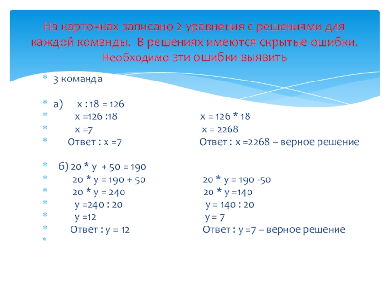 На карточках записано 2 уравнения с решениями для каждой команды. В решениях имеются скрытые ошибки. Необходимо эти ошибки выявить
