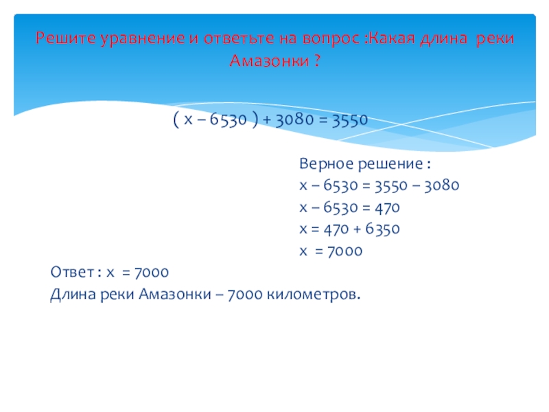 Решите уравнение и ответьте на вопрос :Какая длина реки Амазонки ?