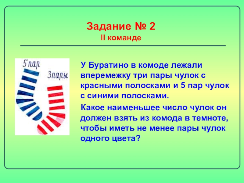 Задание № 2  II командеУ Буратино в комоде лежали вперемежку три пары чулок с красными полосками