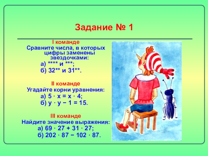 Задание № 1I команде Сравните числа, в которых цифры заменены звездочками: 		а) **** и ***;  		б)