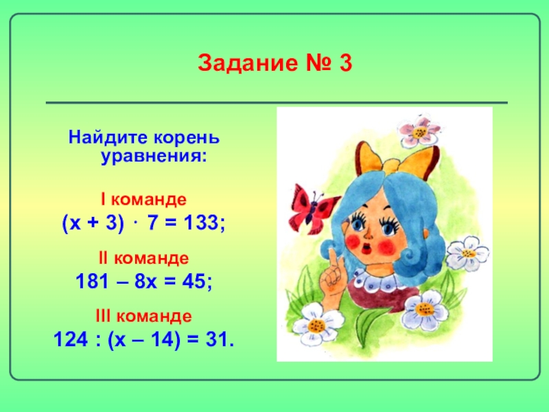 Задание № 3Найдите корень уравнения:I команде (х + 3) ⋅ 7 = 133; II команде 181 –