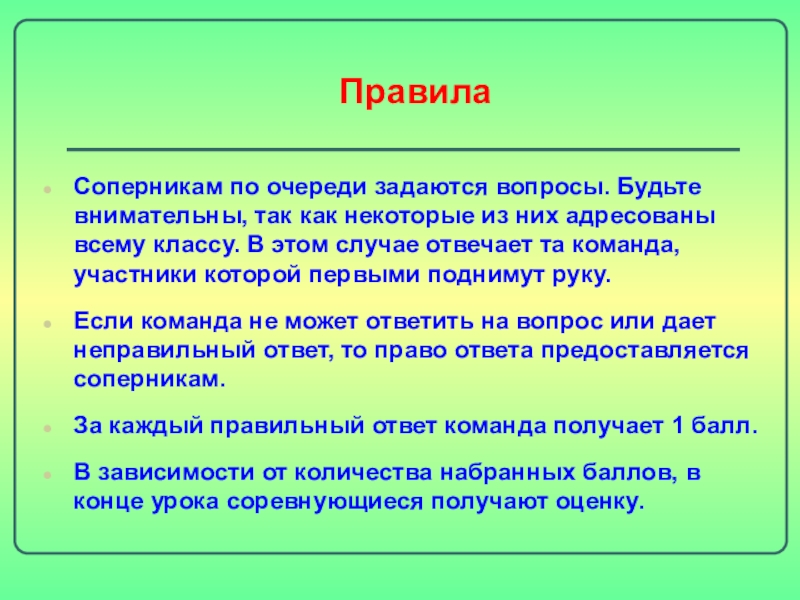 ПравилаСоперникам по очереди задаются вопросы. Будьте внимательны, так как некоторые из них адресованы всему классу. В этом случае отвечает та команда, участники которой первыми поднимут руку. Если команда не может ответить на вопрос или дает неправильный