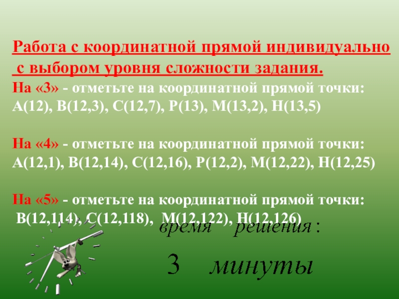 Работа с координатной прямой индивидуально с выбором уровня сложности задания.На «3» - отметьте на координатной прямой точки: