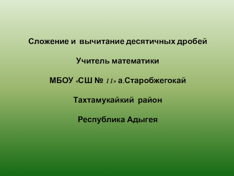 Слайд 11 Сложение и вычитание десятичных дробей Учитель математики МБОУ «СШ № 11» а.Старобжегокай Тахтамукайкий район Республика