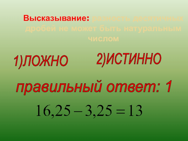 Слайд 17Высказывание: разность десятичных дробей не может быть натуральным числом