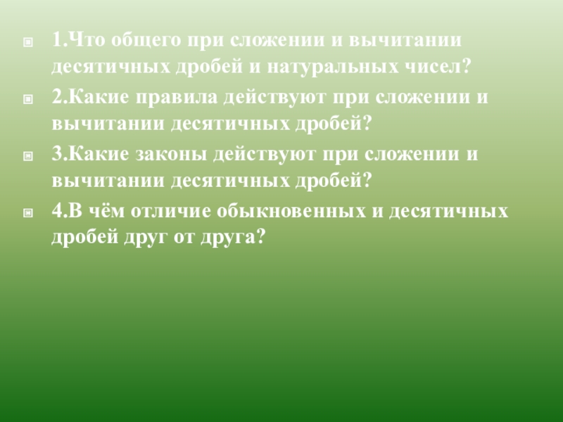 1.Что общего при сложении и вычитании десятичных дробей и натуральных чисел?2.Какие правила действуют при сложении и вычитании