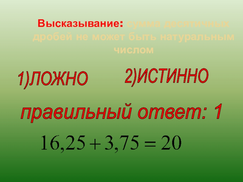 Слайд 16Высказывание: сумма десятичных дробей не может быть натуральным числом