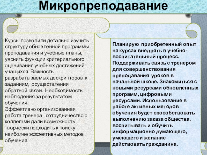 Курсы позволили детально изучить структуру обновленной программы преподавания и учебные планы, уяснить функции критериального оценивания учебных достижений учащихся. Важность разрабатываемых дескрипторов к заданиям, осуществления обратной связи. Необходимость наблюдения за результатом обучения.
