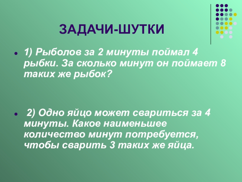 ЗАДАЧИ-ШУТКИ1) Рыболов за 2 минуты поймал 4 рыбки. За сколько минут он поймает 8 таких же рыбок?