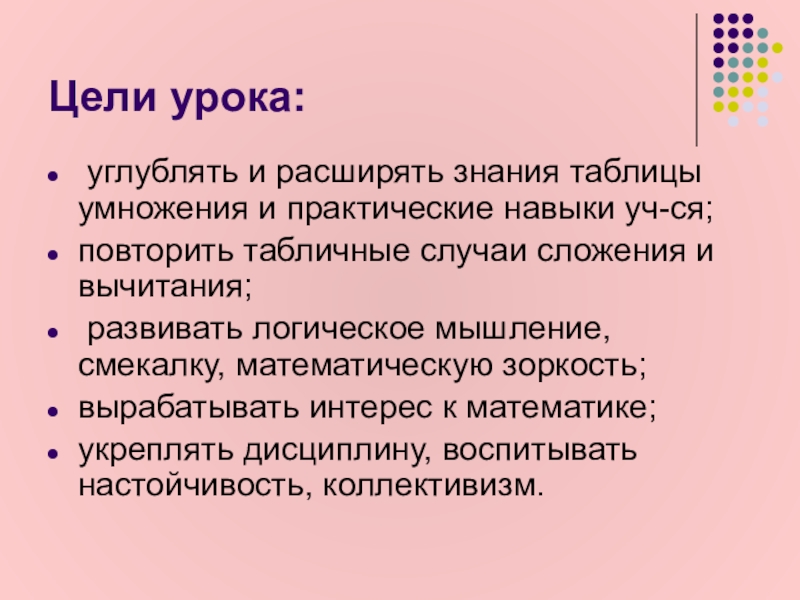 Цели урока: углублять и расширять знания таблицы умножения и практические навыки уч-ся; повторить табличные случаи сложения и