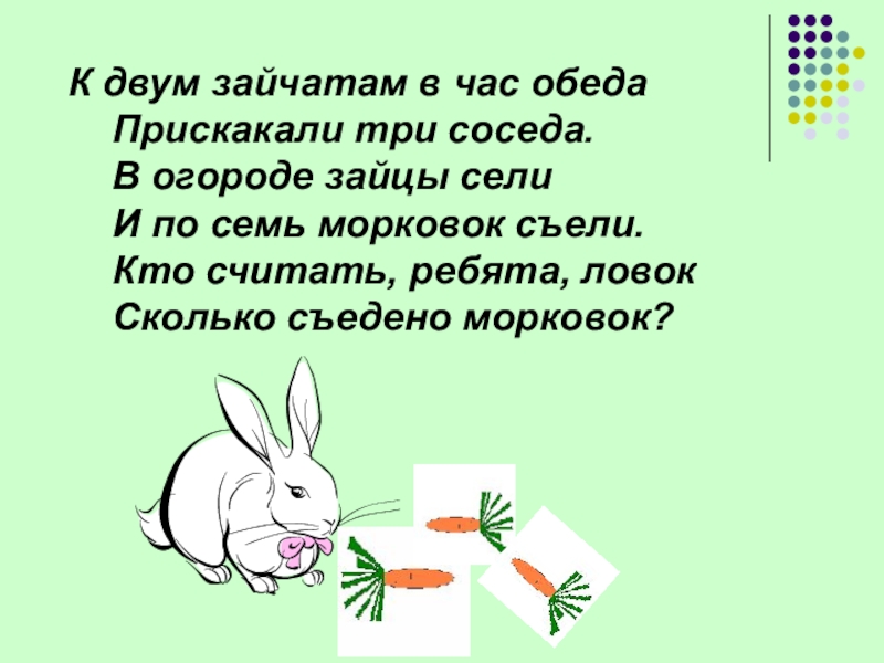 К двум зайчатам в час обеда	Прискакали три соседа.	В огороде зайцы сели	И по семь морковок съели.	Кто считать, ребята,