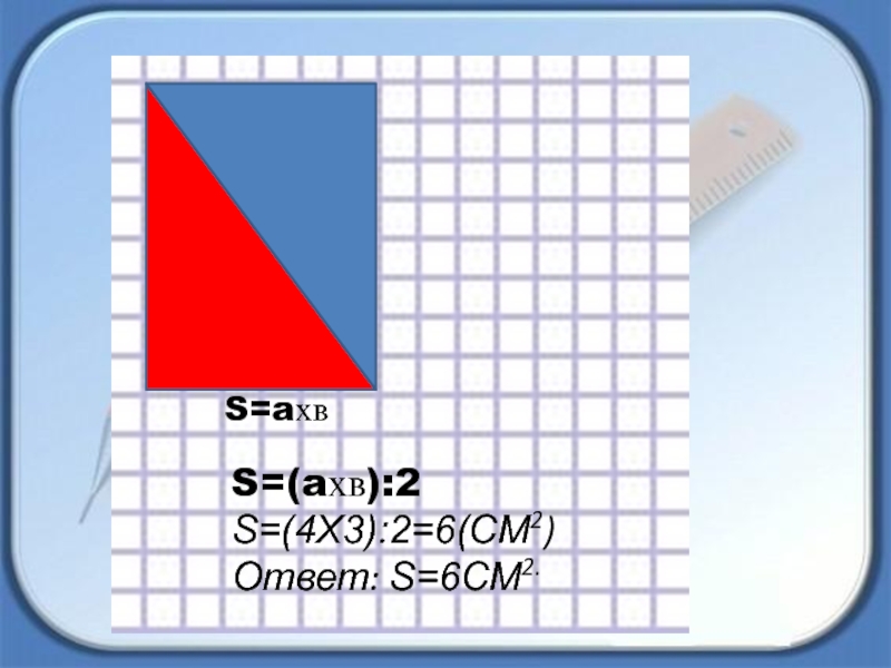 S=aхвS=(aхв):2S=(4Х3):2=6(СМ2)Ответ: S=6СМ2.