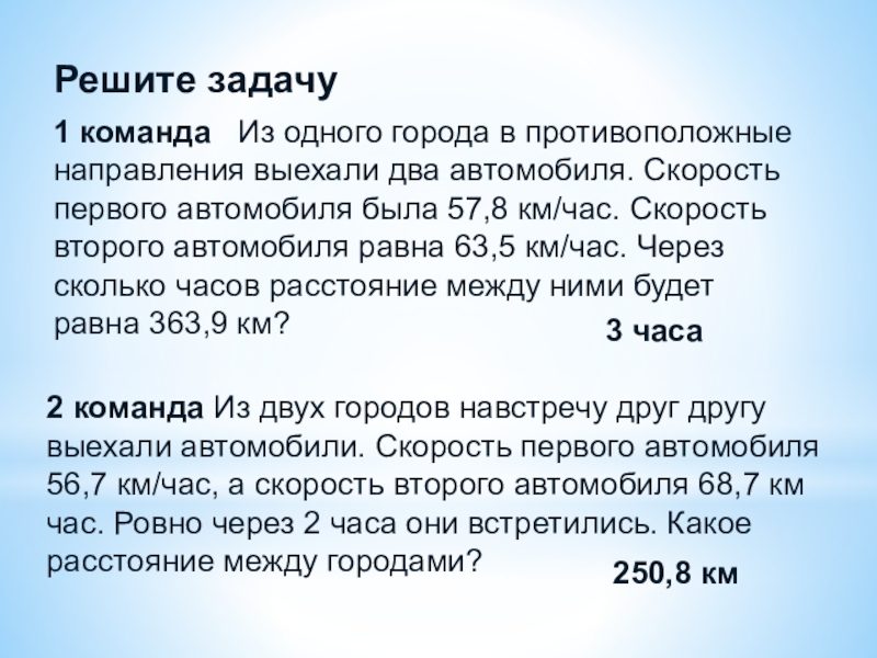 2 команда Из двух городов навстречу друг другу выехали автомобили. Скорость первого автомобиля 56,7 км/час, а скорость второго автомобиля 68,7 км час. Ровно через 2 часа они встретились. Какое расстояние между городами?