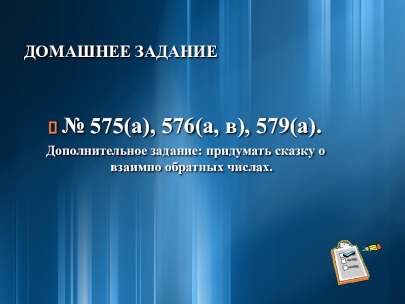 ДОМАШНЕЕ ЗАДАНИЕ№ 575(а), 576(а, в), 579(а).Дополнительное задание: придумать сказку о взаимно обратных числах.