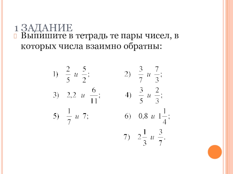 1 ЗАДАНИЕВыпишите в тетрадь те пары чисел, в которых числа взаимно обратны:
