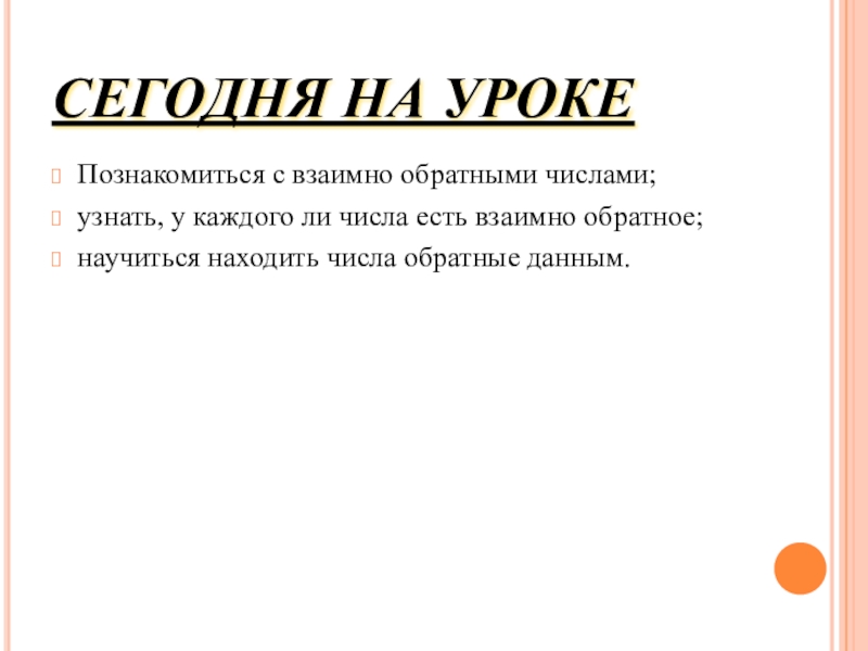 СЕГОДНЯ НА УРОКЕПознакомиться с взаимно обратными числами;узнать, у каждого ли числа есть взаимно обратное;научиться находить числа обратные