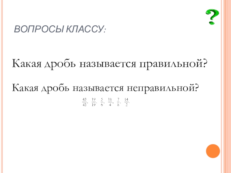 ВОПРОСЫ КЛАССУ:Какая дробь называется правильной?Какая дробь называется неправильной?