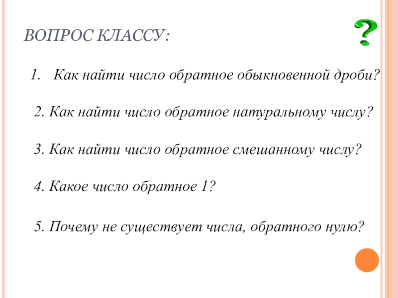 ВОПРОС КЛАССУ:Как найти число обратное обыкновенной дроби?2. Как найти число обратное натуральному числу?3. Как найти число обратное