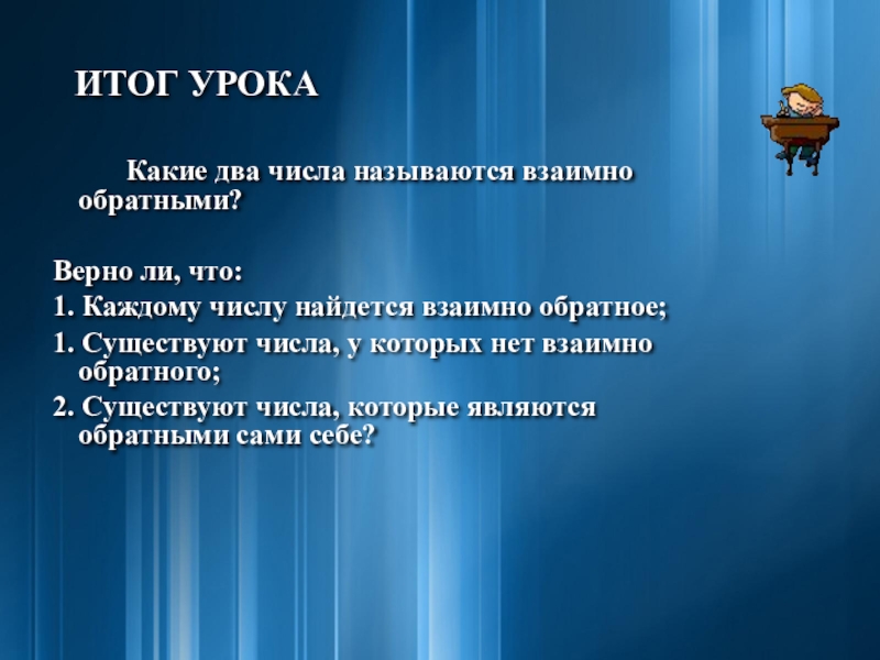 ИТОГ УРОКА     Какие два числа называются взаимно обратными? Верно ли, что:1. Каждому числу