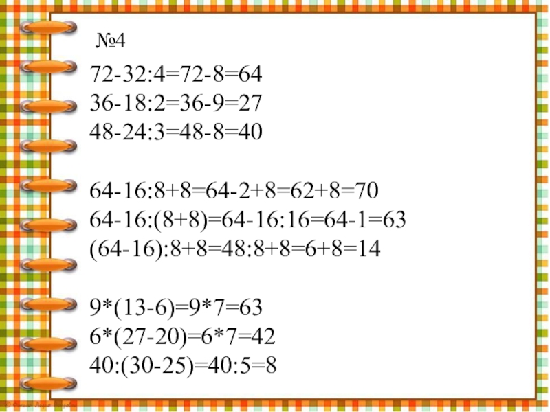 №472-32:4=72-8=64   36-18:2=36-9=2748-24:3=48-8=4064-16:8+8=64-2+8=62+8=7064-16:(8+8)=64-16:16=64-1=63(64-16):8+8=48:8+8=6+8=149*(13-6)=9*7=636*(27-20)=6*7=4240:(30-25)=40:5=8