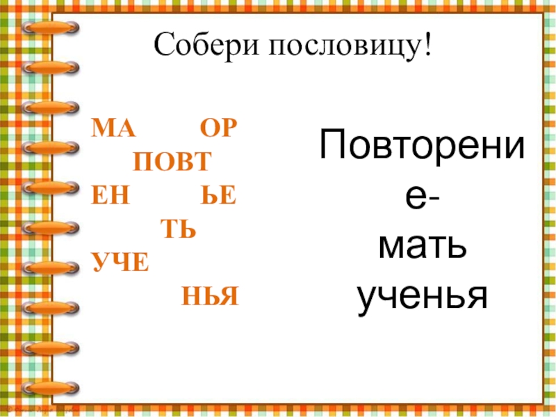 Собери пословицу!МА ОР ПОВТЕН ЬЕ ТЬ УЧЕ НЬЯ Повторение-мать ученья
