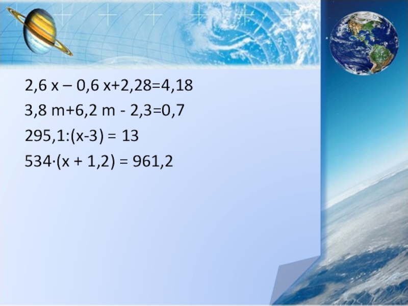 2,6 x – 0,6 x+2,28=4,183,8 m+6,2 m - 2,3=0,7295,1:(x-3) = 13534∙(x + 1,2) = 961,2