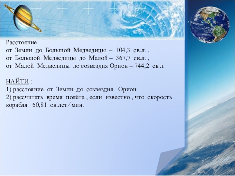 Расстояние от Земли до Большой Медведицы – 104,3 св.л. , от Большой Медведицы до Малой – 367,7