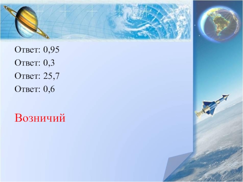 Ответ: 0,95Ответ: 0,3Ответ: 25,7Ответ: 0,6Возничий