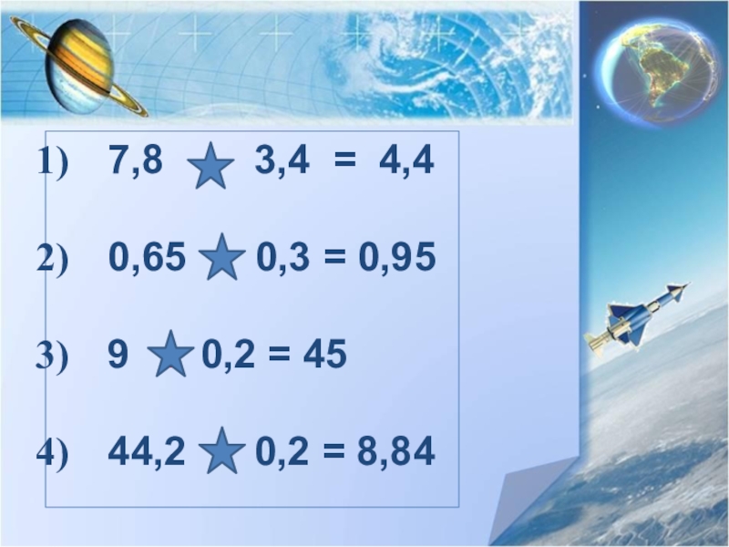 7,8 – 3,4 = 4,40,65 + 0,3 = 0,959 : 0,2 = 4544,2 ∙ 0,2 = 8,84