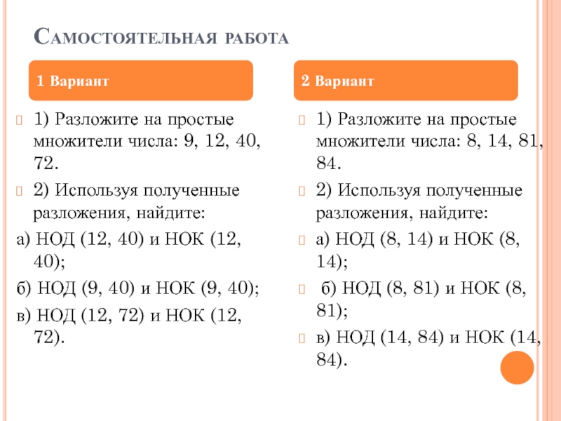 1) Разложите на простые множители числа: 8, 14, 81, 84.