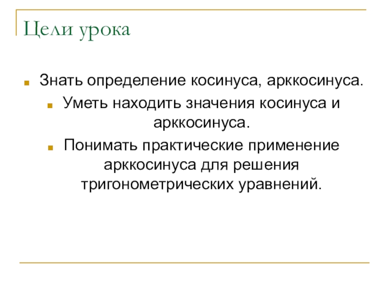 Цели урокаЗнать определение косинуса, арккосинуса.Уметь находить значения косинуса и арккосинуса.Понимать практические применение арккосинуса для решения тригонометрических уравнений.