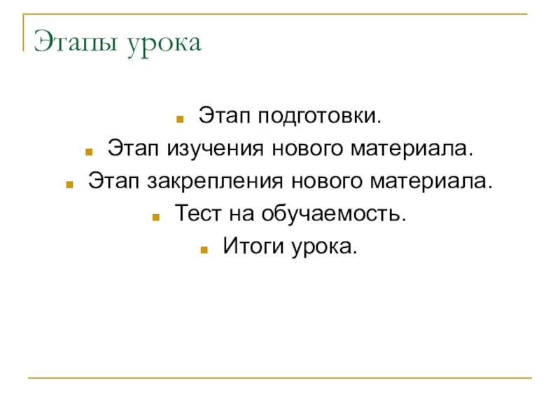 Этапы урокаЭтап подготовки.Этап изучения нового материала.Этап закрепления нового материала.Тест на обучаемость.Итоги урока.