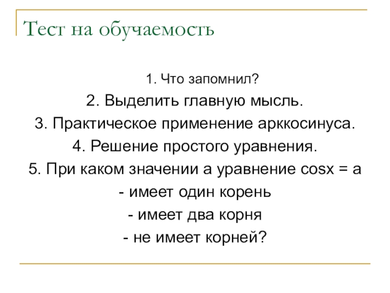 Тест на обучаемость1. Что запомнил?2. Выделить главную мысль.3. Практическое применение арккосинуса.4. Решение простого уравнения.5. При каком значении