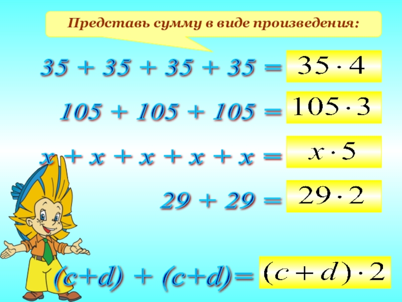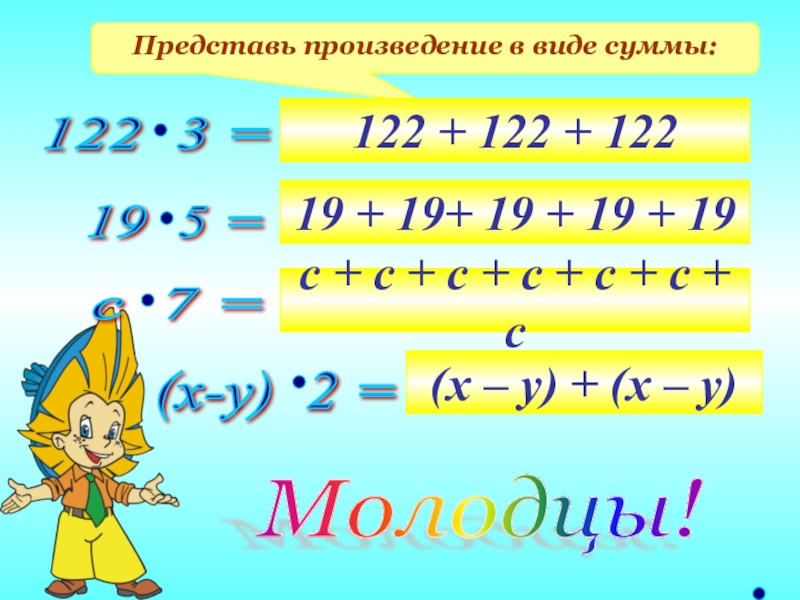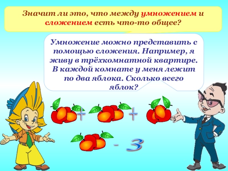Умножение можно представить с помощью сложения. Например, я живу в трёхкомнатной квартире. В каждой комнате у меня лежит по два яблока. Сколько всего яблок?
