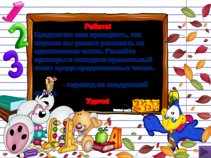 Ребята!Предлагаю вам проверить, как хорошо вы умеете умножать на однозначное число. Решайте примеры и находите правильный ответ