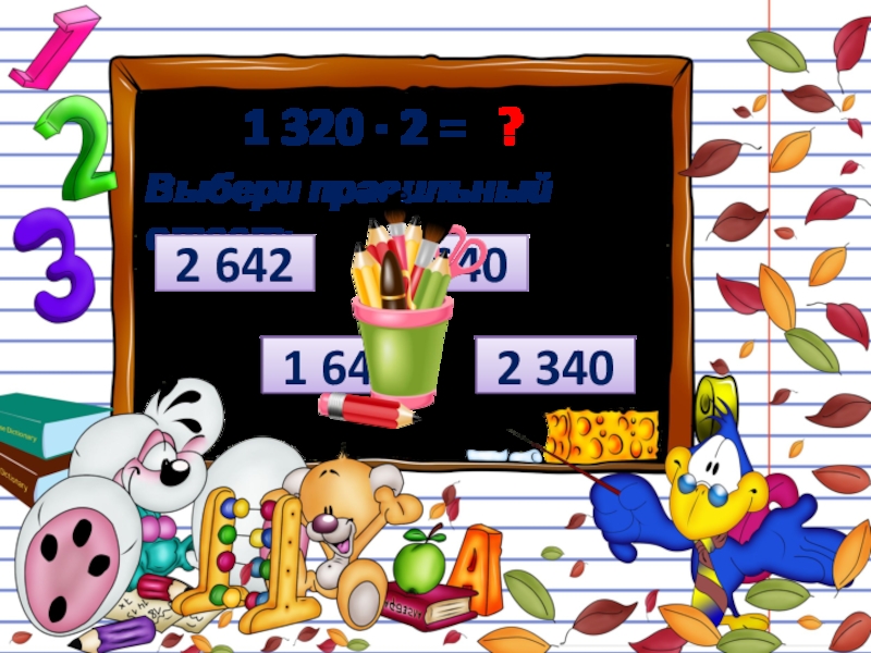 1 320 ∙ 2 = ?Выбери правильный ответ:2 3402 6422 6401 640