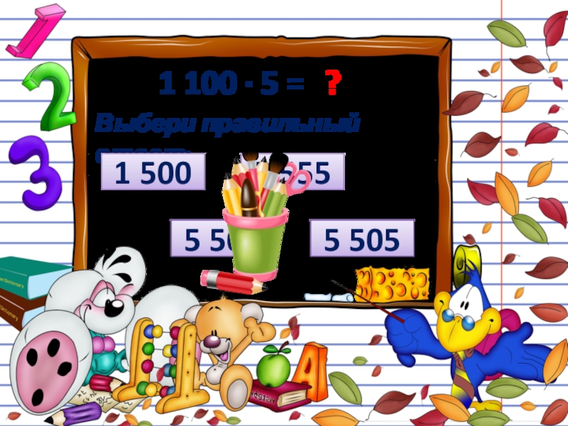 1 100 ∙ 5 = ?Выбери правильный ответ:5 5051 5005 5005 555