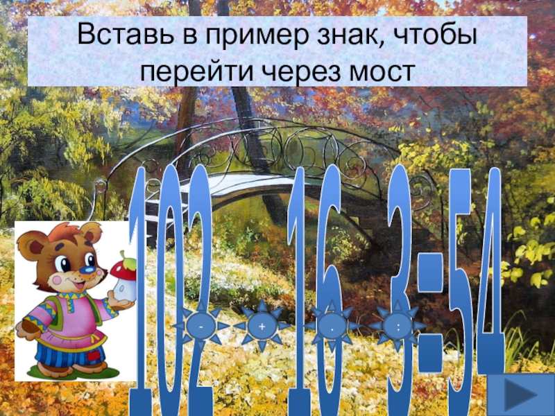 Вставь в пример знак, чтобы перейти через мост102   16  3=54-+.: