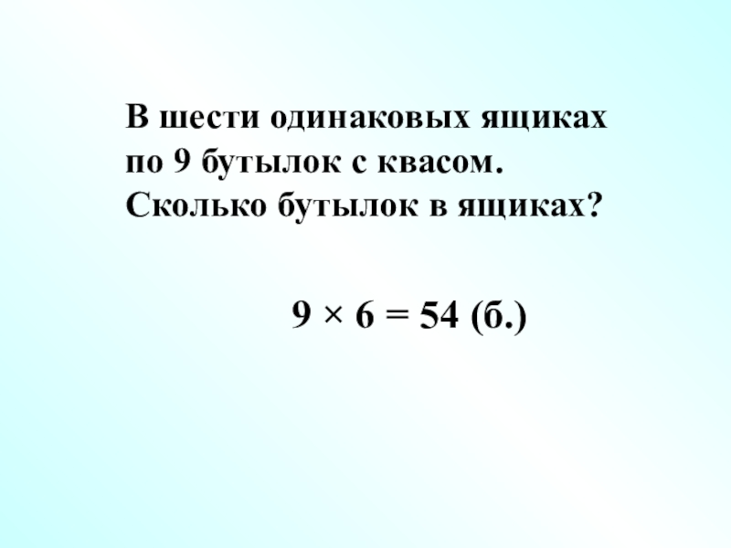 Слайд 6В шести одинаковых ящиках по 9 бутылок с квасом. Сколько бутылок