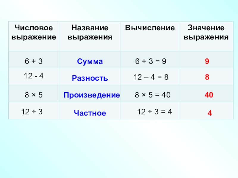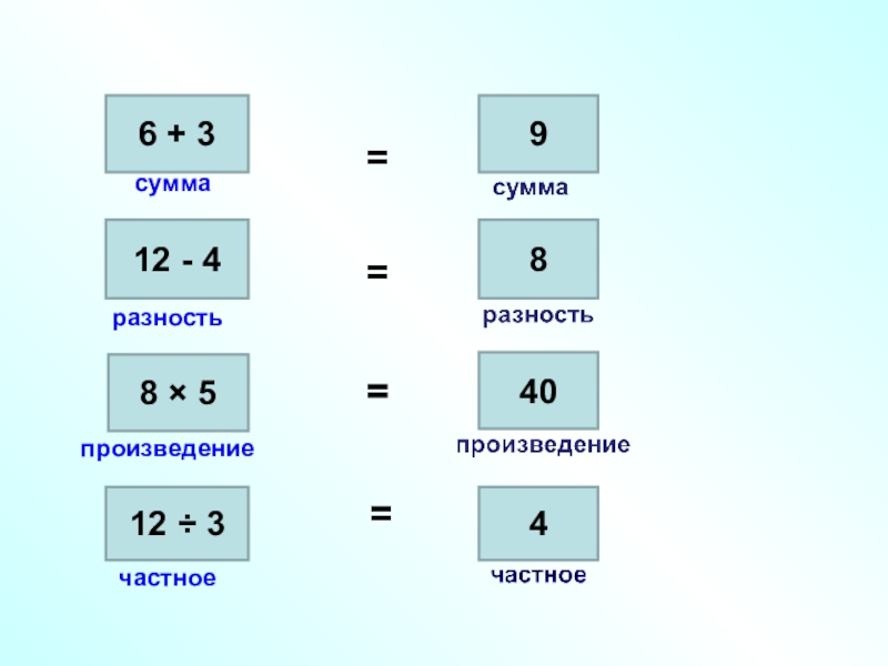 6 + 3 12 - 48 × 512 ÷ 3Сумма РазностьПроизведениеЧастное6 + 3 = 912 – 4