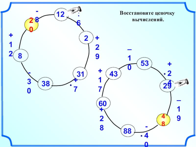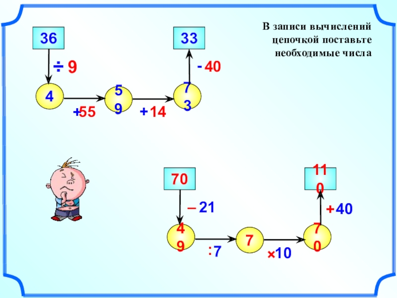 Слайд 2В записи вычислений цепочкой поставьте необходимые числа