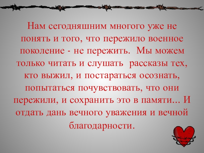 Слайд 12Нам сегодняшним многого уже не понять и того, что пережило военное