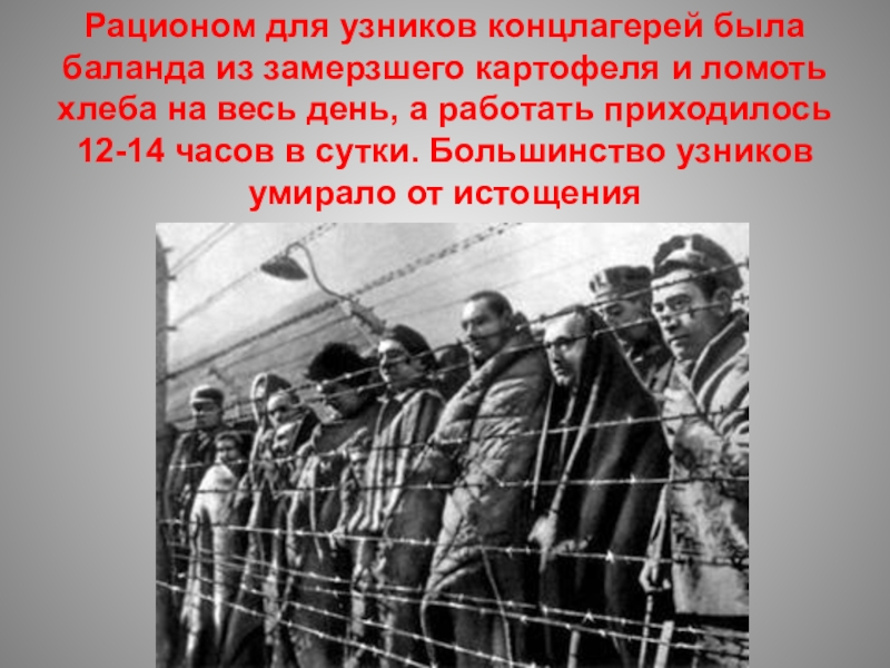 Слайд 59Рационом для узников концлагерей была баланда из замерзшего картофеля и ломоть