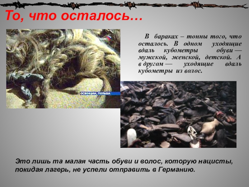 Это лишь та малая часть обуви и волос, которую нацисты, покидая лагерь, не успели отправить в Германию.