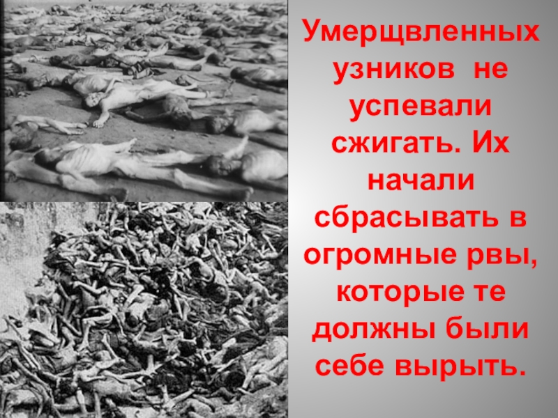 Слайд 48Умерщвленных узников не успевали сжигать. Их начали сбрасывать в огромные рвы,