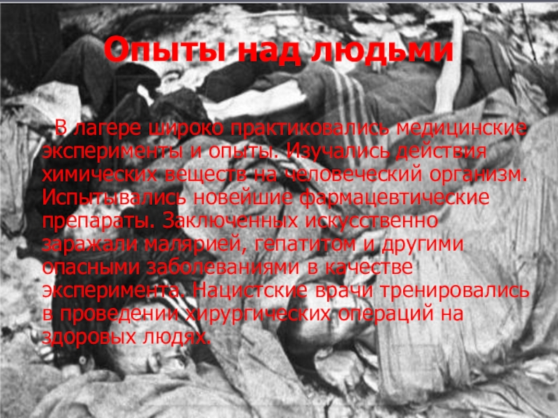 и опыты. Изучались действия химических веществ на человеческий организм. Испытывались новейшие фармацевтические препараты. Заключенных искусственно заражали малярией, гепатитом и другими опасными заболеваниями в качестве эксперимента. Нацистские врачи тренировались в проведении хирургических операций на здоровых людях.