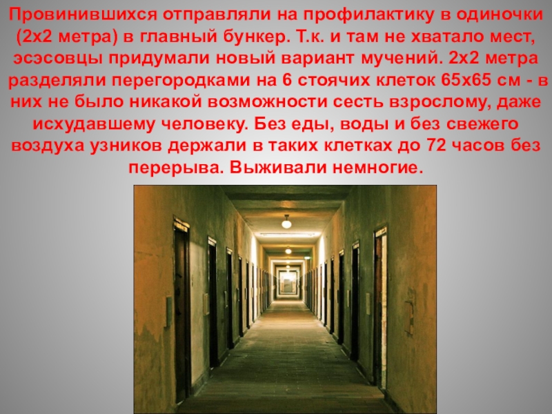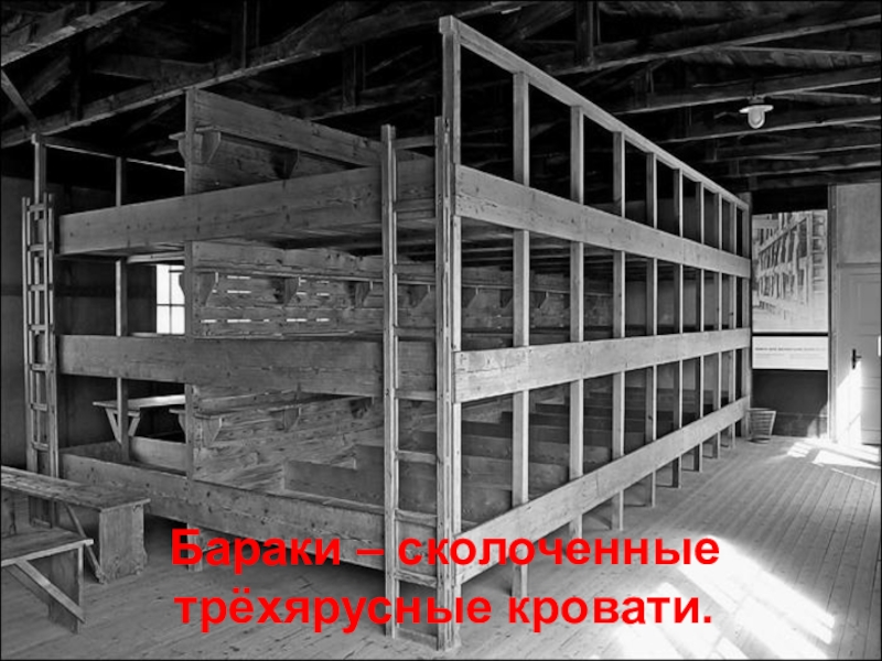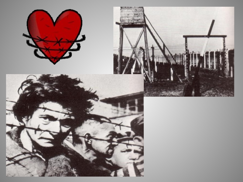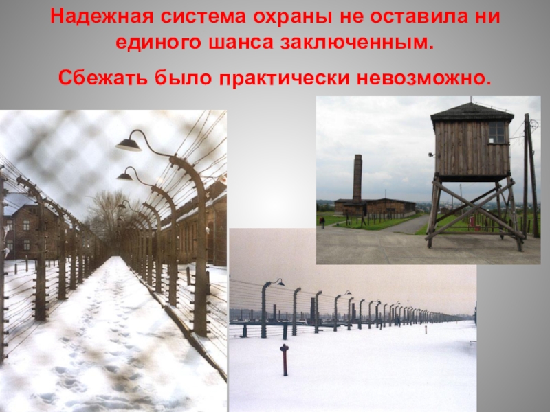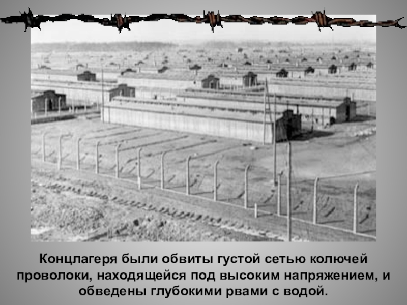 Слайд 22Концлагеря были обвиты густой сетью колючей проволоки, находящейся под высоким напряжением,